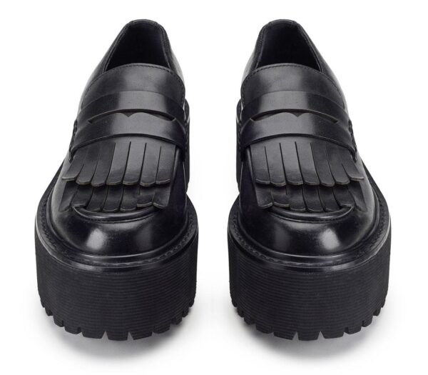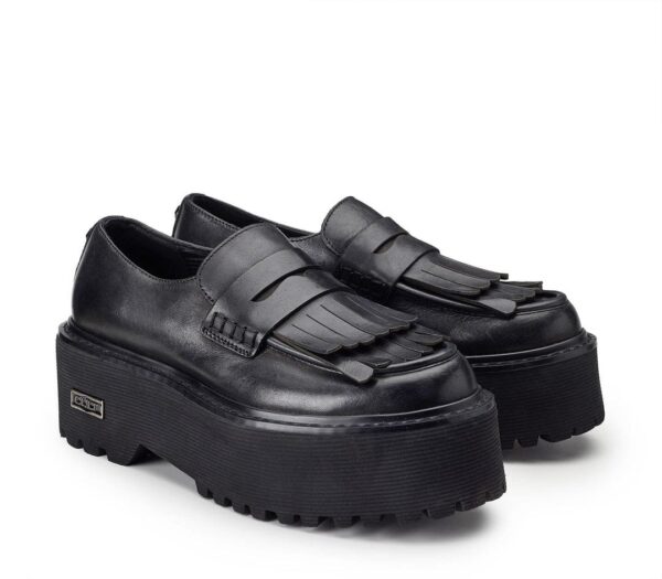 I mocassini AXL realizzati in pelle nera di Cult reinterpretano in chiave inedita e contemporanea il classico penny loafer con frangia. Poggiano su una maxi suola extralight in EVA impreziosita con l’iconica targhetta metallica con il logo del brand, questo modello è l’espressione di un design senza tempo e stile