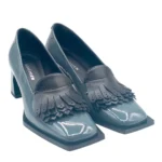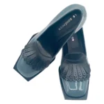 Dall’inconfondibile stile Le Bohemien tomaia con frangia in vitello nero fondo dalla caratteristica forma esagonale brevettata dall’azienda e tacco largo di 6 cm ricoperto dalla stessa pelle lucida.