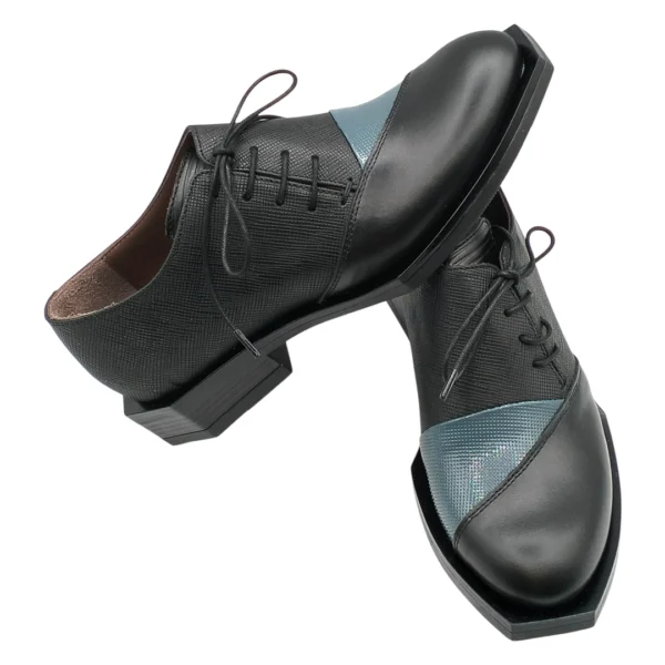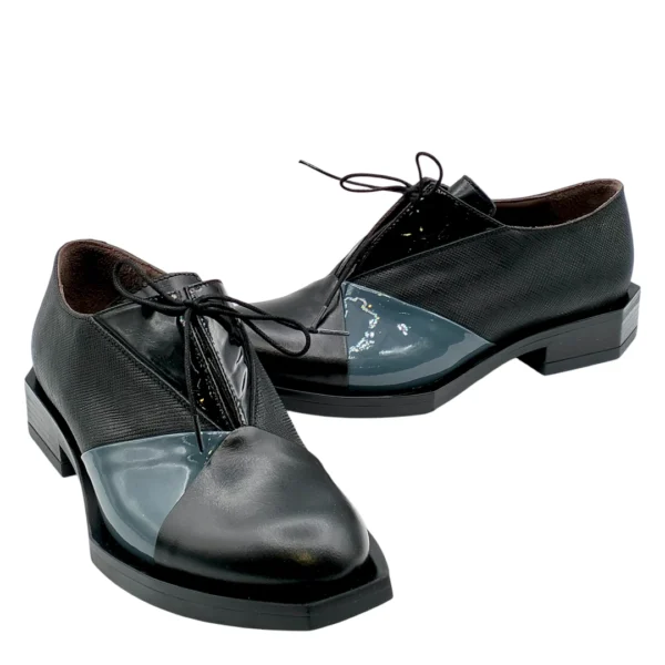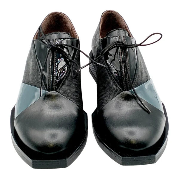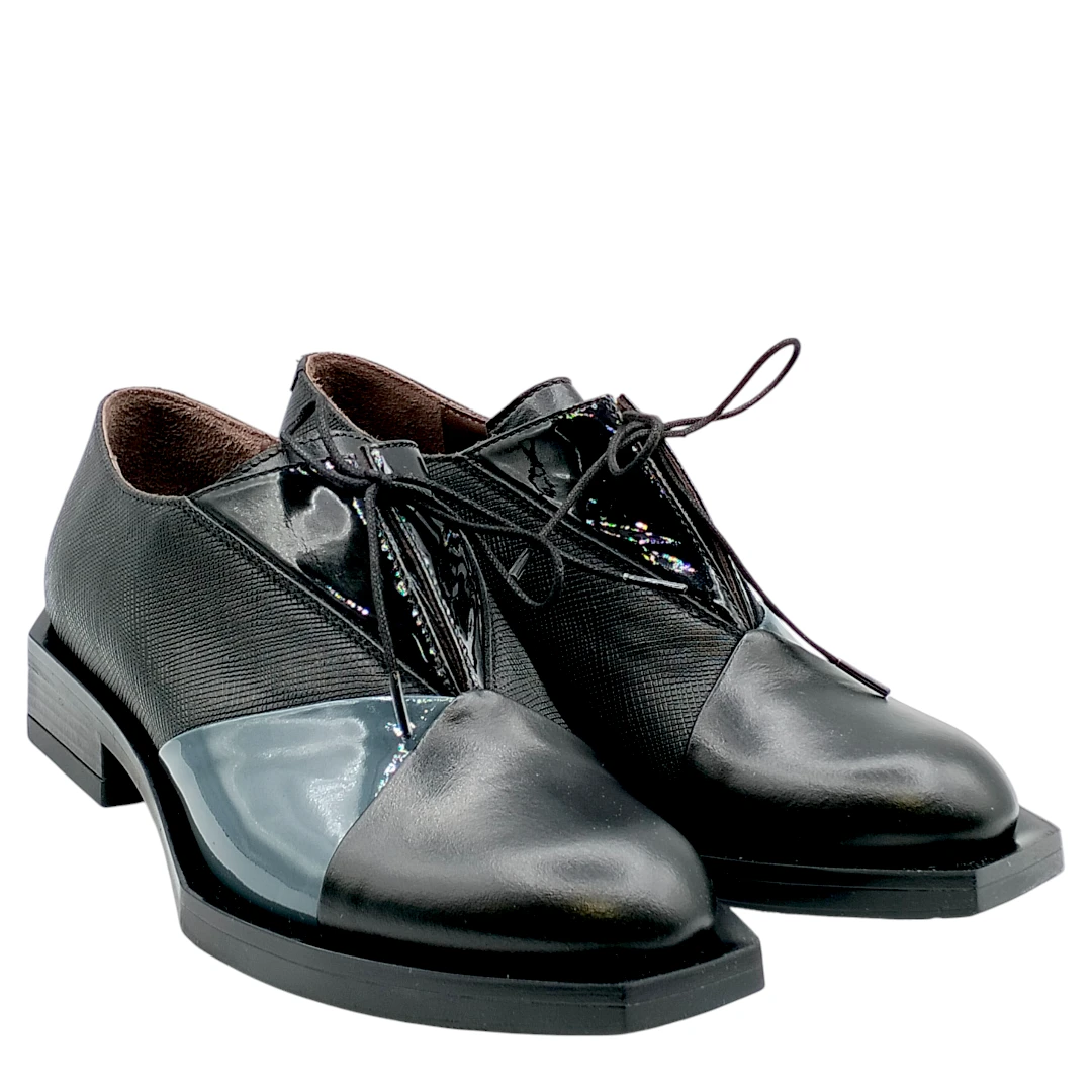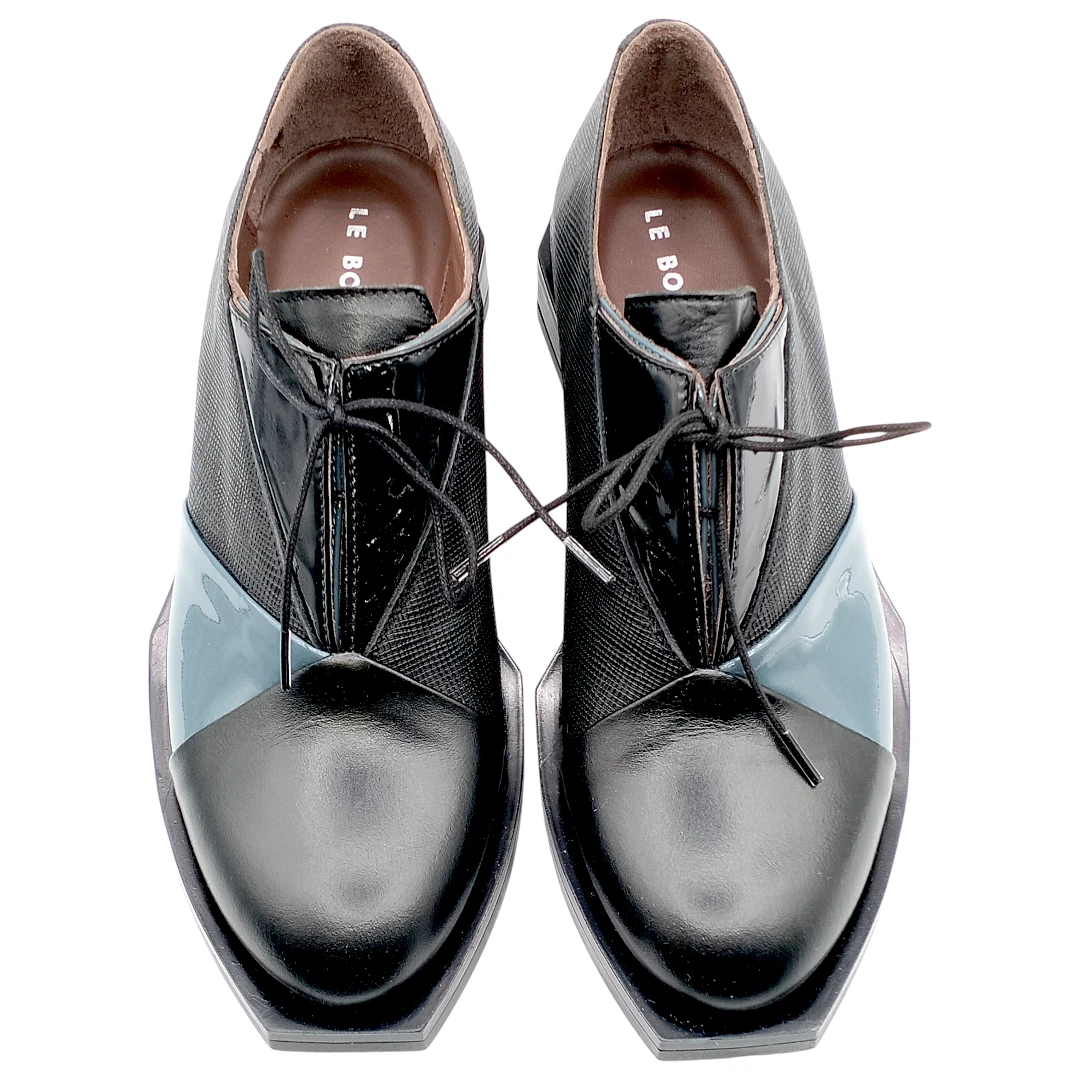 Francesina interamente in pelle con tomaia a lavorazione geometrica grazie al mix di pelle lucida e non.